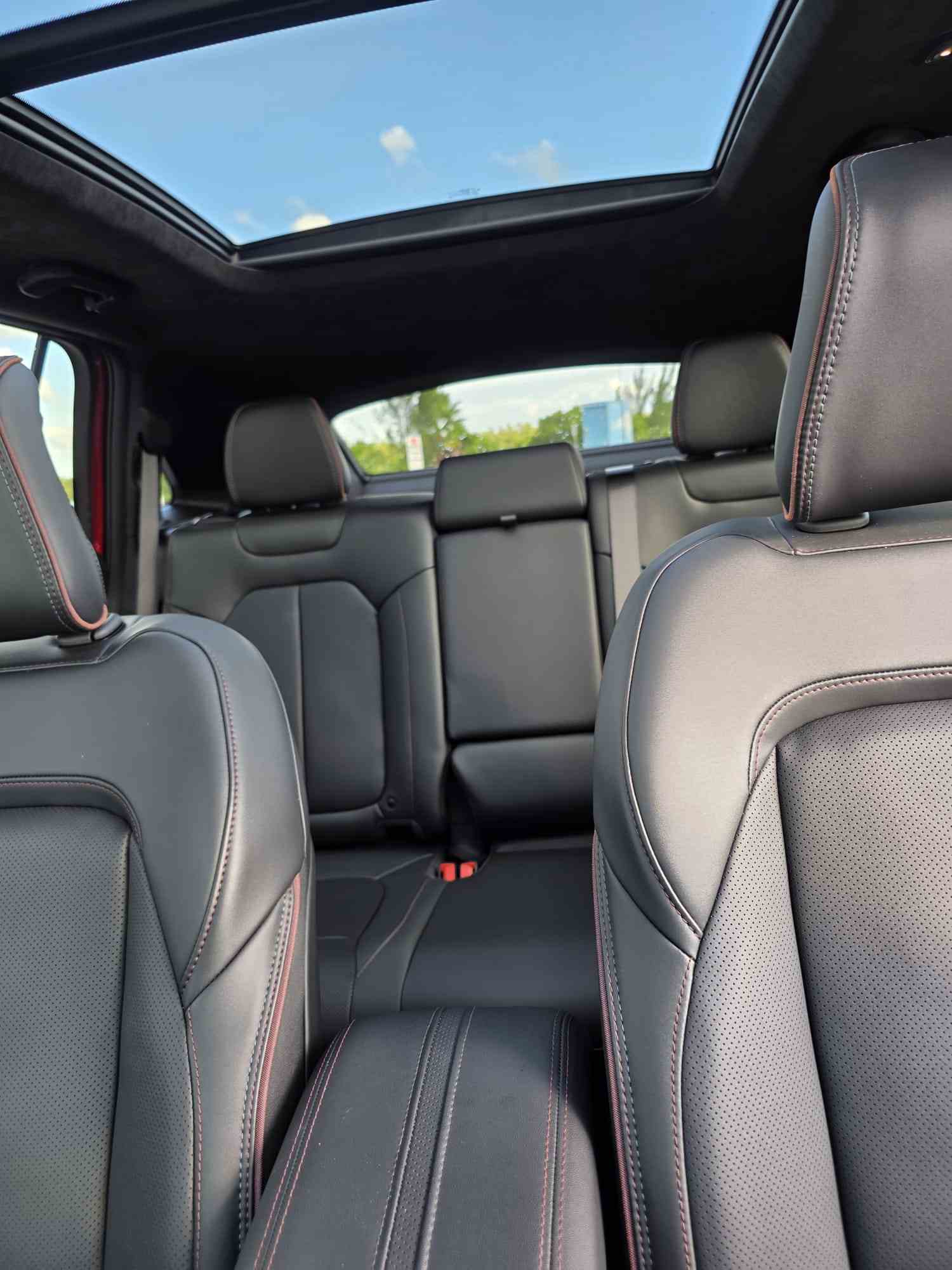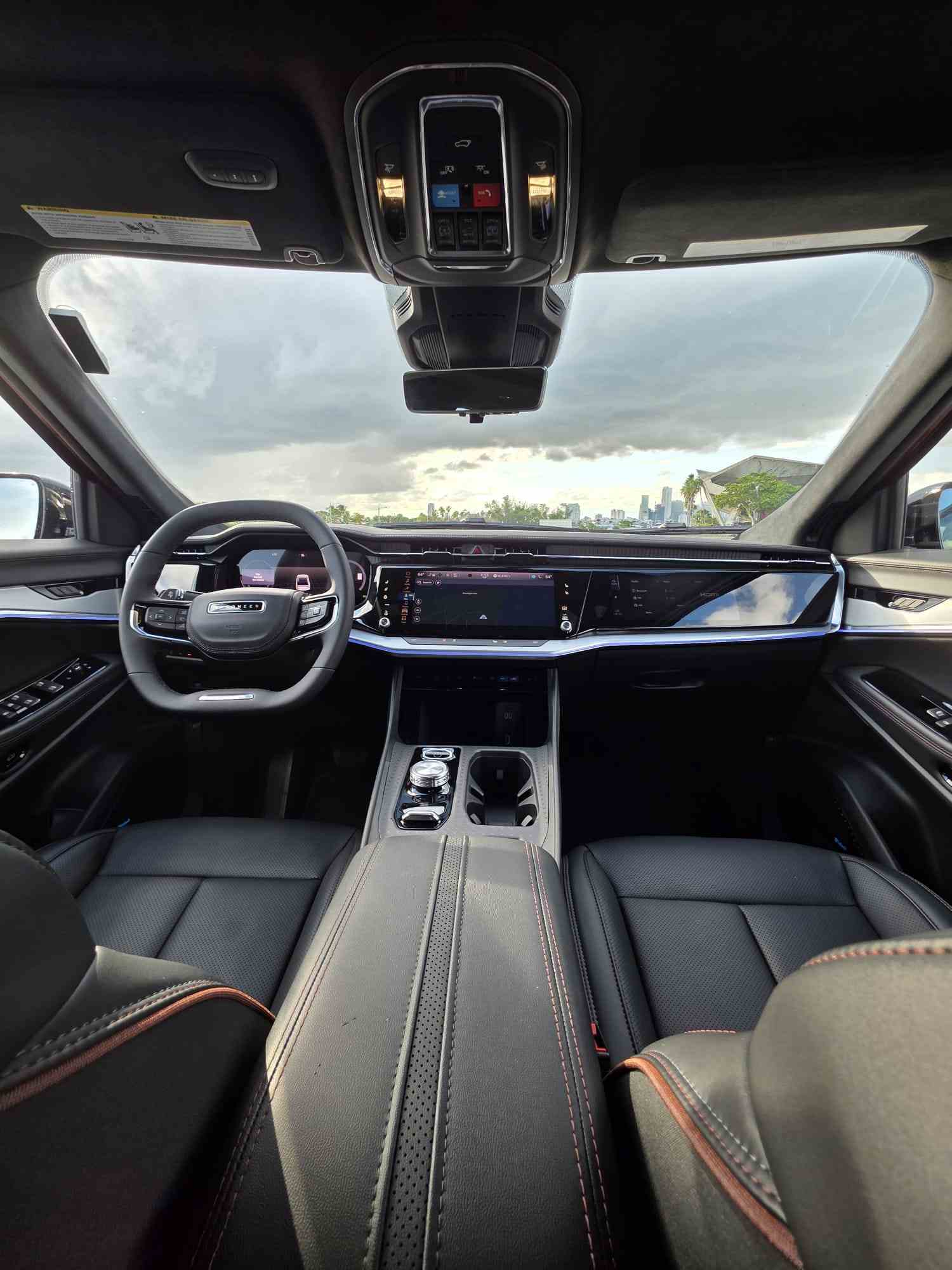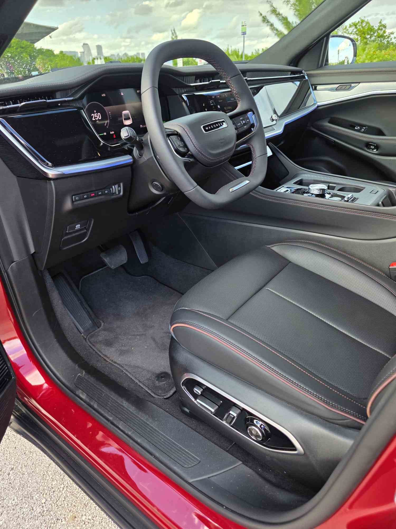 Aunque el Wagoneer S es considerablemente más pequeño que los actuales Wagoneer y Grand Wagoneer de gasolina, con los que comparte nombre, su interior conserva muchos de los elementos de diseño característicos de esos modelos. Un volante de radios dobles y base plana con costuras rojas acentuadas incorpora una nueva envoltura de vinilo antimicrobiano. Los asientos delanteros y traseros con calefacción y refrigeración, tapizados en símil piel, son de serie, y una combinación de materiales, incluyendo apliques metálicos decorativos, realza el interior.